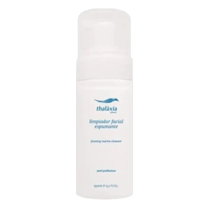 El limpiador facial espumante thalàxia anti-pollution es un desmaquillante de bruma marina con chalcone de bambú, que promueve una suave exfoliación, y contiene una invisible malla antipolución epigenética